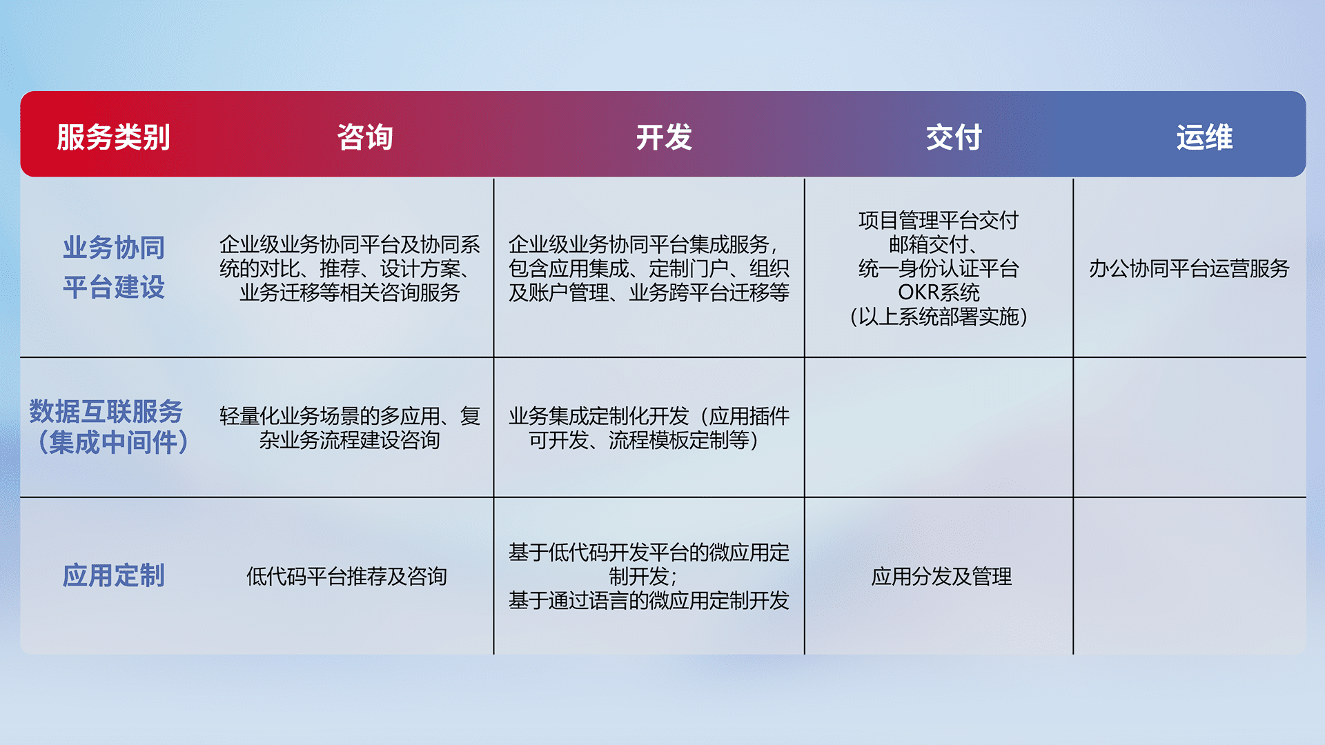 针对钉钉、、企微、、IDaas等平台级产品提供产品的规划、、、方案、、、、交付、、定制化开发等服务,,,,实现如统一协同办公、、、、智能客户服务、、、混合会议管理、、智能数据查询、、、等业务场景,,实现数字化转型。。。。